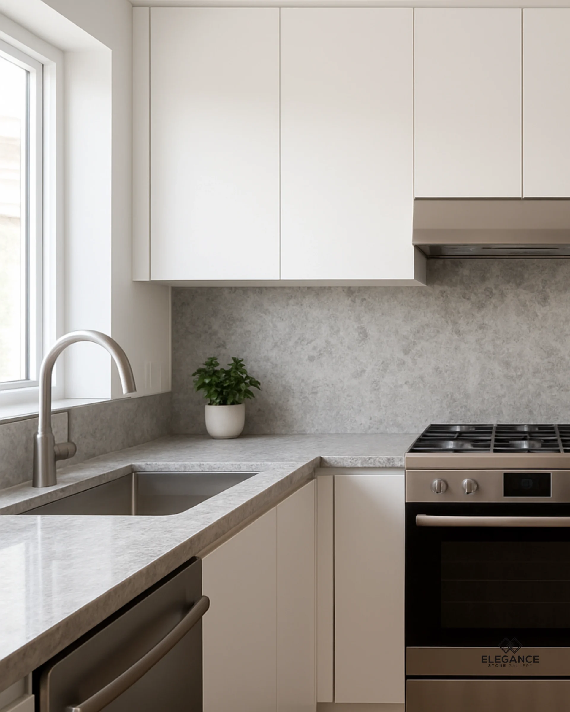 This stone works well on kitchen benchtops, island benches, and bathroom vanities, particularly when paired with light cabinetry or timber accents. Slab variation is generally controlled but should be reviewed where multiple surfaces need to align visually.