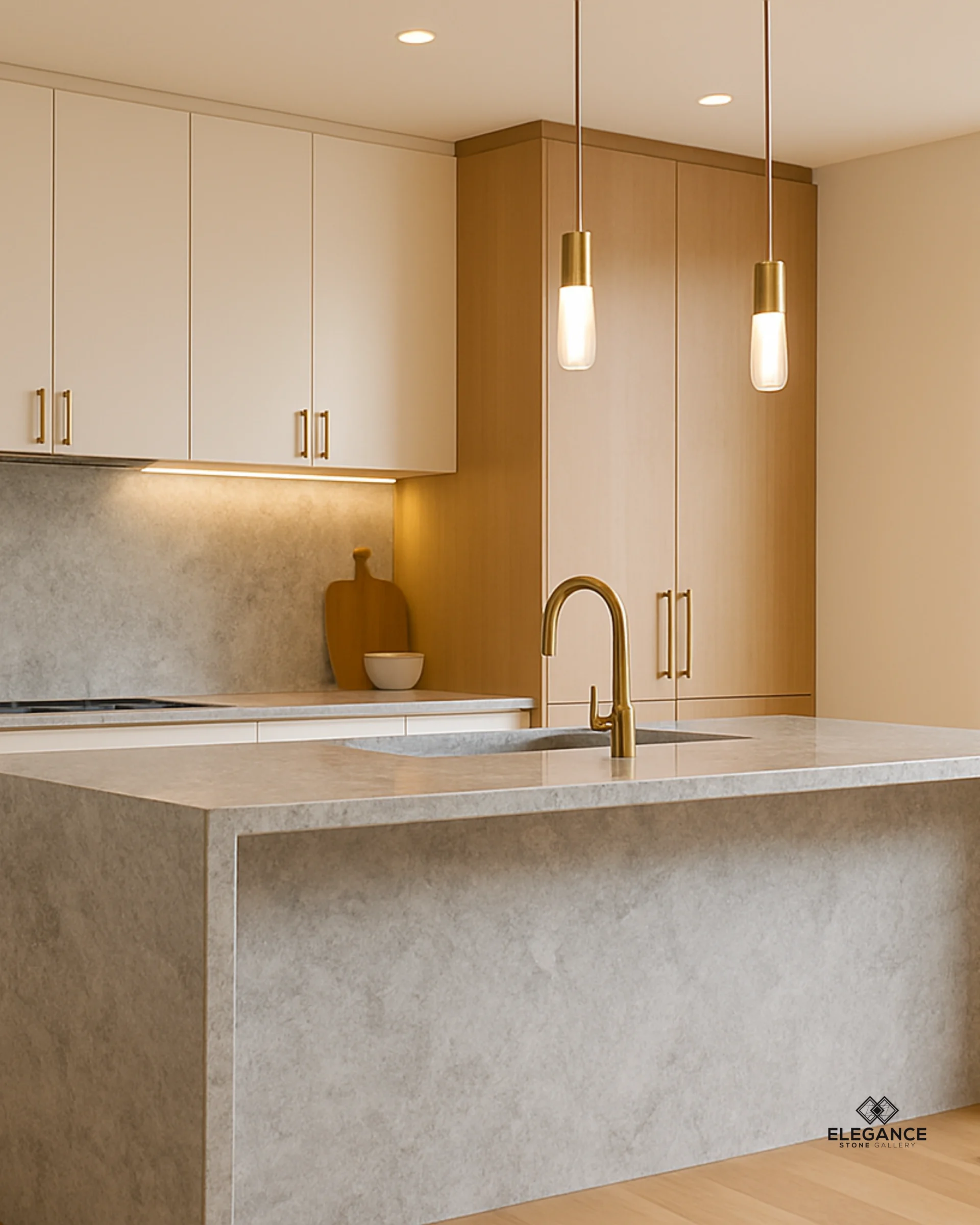 This stone works well on kitchen benchtops, islands, and bathroom vanities, pairing easily with both light and dark cabinetry. Natural variation is usually gentle but should still be reviewed before fabrication.